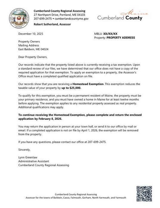 BALDWIN'S ASSESSING AGENT, CUMBERLAND COUNTY REGIONAL ASSESSING, WILL BE SENDING OUT LETTERS TO THOSE RECEIVING EXEMPTIONS WITH MISSING APPLICATIONS ON FILE. THE ASSESSING AGENT, ON BEHALF OF THE TOWN, IS REQUIRED TO REMOVE THE EXEMPTION FROM THE NEXT TAX COMMITMENT IF THE OWNER DOES NOT RETURN A NEW APPLICATION. IT IS OUR UNDERSTANDING THAT THIS PRIMARILY IMPACTS THOSE WITH MISSING HOMESTEAD AND VETERAN EXEMPTION APPLICATIONS. WE APOLOGIZE FOR ANY INCONVENIENCE THIS MAY CAUSE, HOWEVER, IT IS OUR GOAL TO ASSIST OUR TAX PAYERS IN CONTINUING TO RECEIVE EXEMPTIONS FOR WHICH THEY QUALIFY.